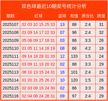 上期红球质合比为2:4;跨度为29,和值为97。 最近10期双色球奖号统计分析表